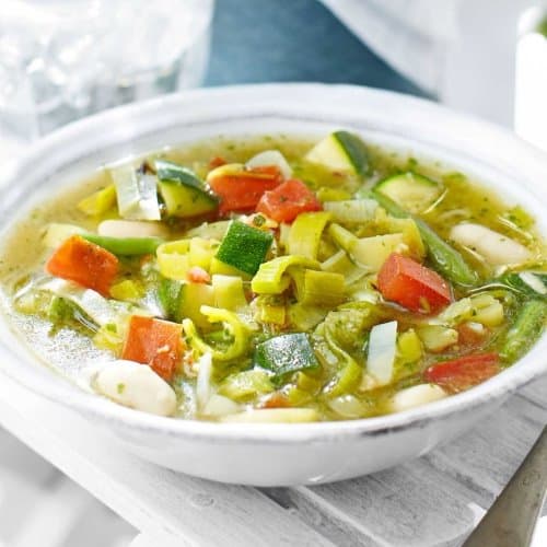 Heat the oil in a large pan and fry the leeks and courgette for 5 mins to soften. Pour in the stock, add three-quarters of the haricot beans with the green beans, half the tomatoes, and simmer for 5-8 mins until the vegetables are tender.