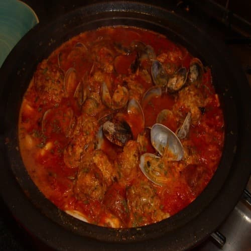 Add the pork mince and the egg yolk to the bowl, then beat well. Shape into 18 small meatballs. Wipe the pan, put on a medium-high heat, then add the oil. Fry the meatballs for 5 mins, just to colour, then lift onto a plate, but keep the oil in the pan. Sizzle the chorizo with the sliced garlic. Add the squid and fry to give a little colour. Now tip in the white wine and bring to the boil, scraping the bottom. Stir in the pulped tomatoes, bring to the boil, then add the meatballs and the clams. Cover and cook for 5 mins until the clam shells open. Discard any that stay shut. Sprinkle with the chopped parsley, drizzle with the extra virgin oil, then serve with crusty bread.