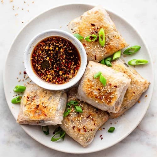 Soak the spring roll sheets for a couple of seconds in a shallow dish of warm water, then transfer to an oiled chopping board. Working with one sheet at a time, spoon 1 heaped tbsp of the filling into the middle, then fold the bottom up and over the filling. Fold down the top of the sheet, then the sides to fully encase and make a neat square. If the dumpling feels a little fragile, soak another sheet and wrap it again. Repeat with the remaining sheets and filling, transferring the dumplings to an oiled plate as you go.